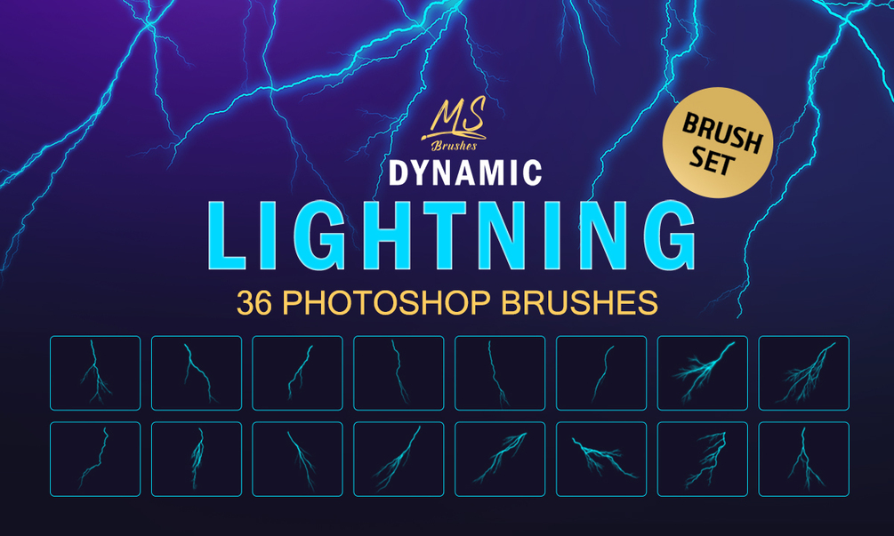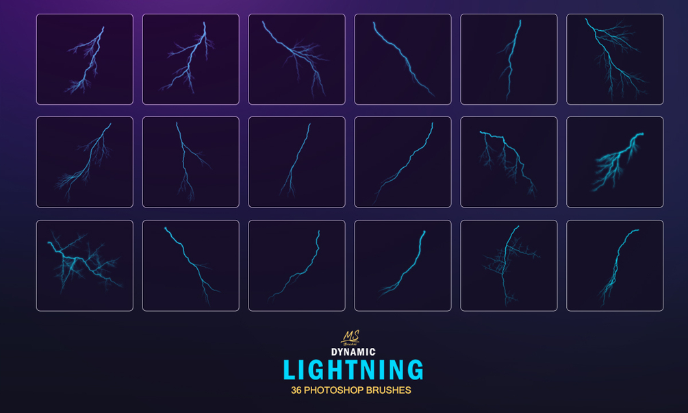 Lightning Brushes is a set of 36 high-quality brushes that can create stunning lightning effects in your digital artworks. You can use them to add realistic or fantasy lightning to your photos, illustrations, or designs. Whether you want to create a dramatic stormy scene, a futuristic sci-fi image, or a magical fantasy artwork,
